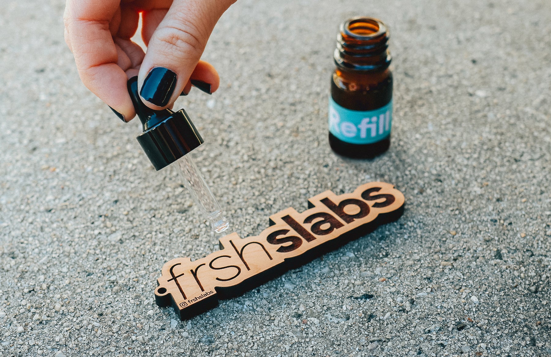 Hanging Frshslabs: Remove the frshslab from your car, to make sure you don't drip oil in unwanted areas. From here you have two options: either lay it on a flat surface with a napkin underneath, or place it in a plastic bag. Apply 5 - 10 drops on your frshslab, until evenly coated - You can add more or less oil to your liking. Once the wood completely absorbs the oil, or is saturated, you're ready to hang it back in your car. (Note: Avoid excess oil on your frshslab. Use a napkin to pat the wood dry as needed, before hanging it back in your car!)